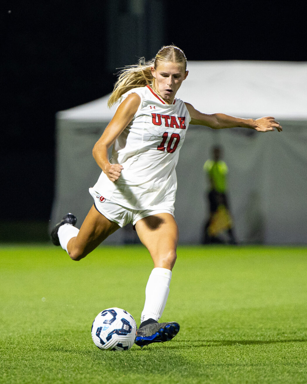 Rine Yonaha, 17, breaks away from a Utah defender while the center referee steps out of the way at Chuck & Gloria Bell Field on Aug 28.