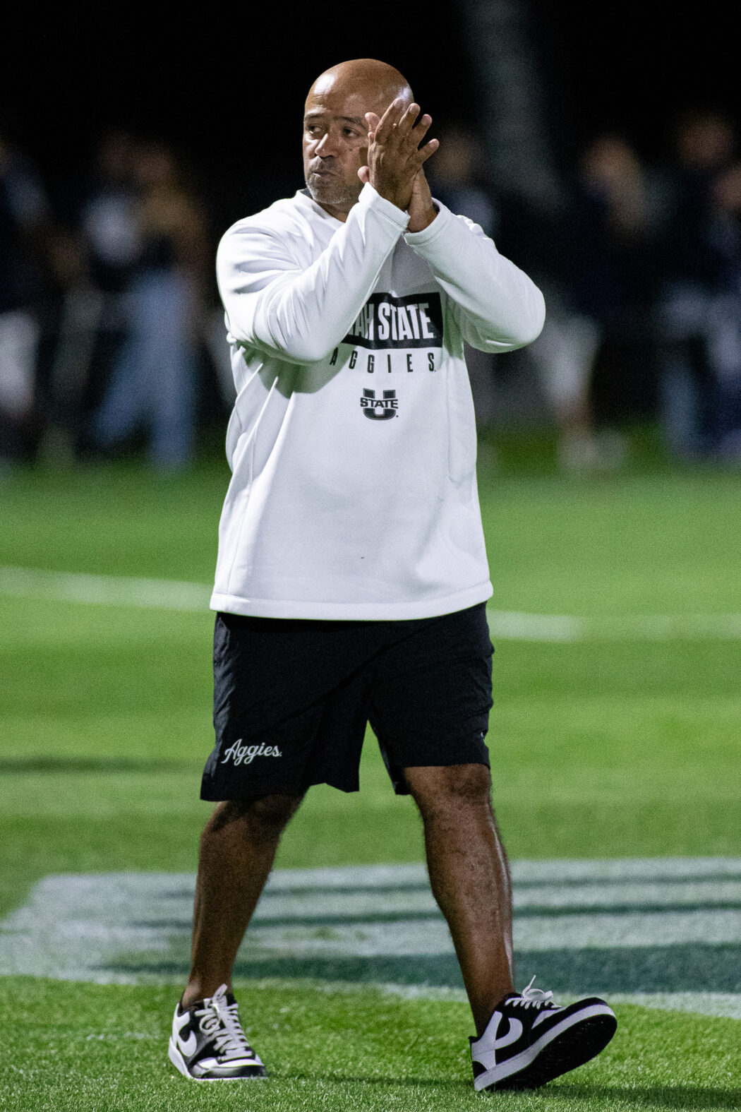 USU Women's Soccer Head Coach Manny Martin claps to fans after USU's game against Utah at Chuck & Gloria Bell Field on Aug 28.
