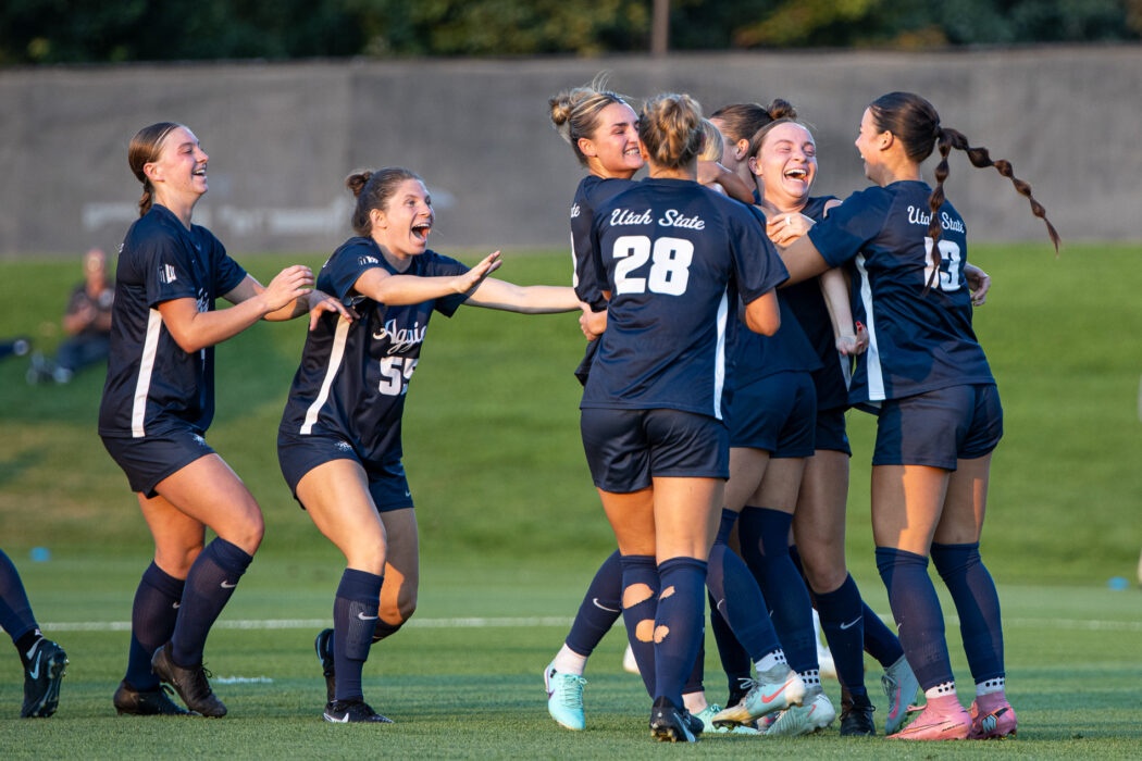 USU teammates rush Ellie Hendrix after scoring a goal on Utah at Chuck & Gloria Bell Field on Aug 28.