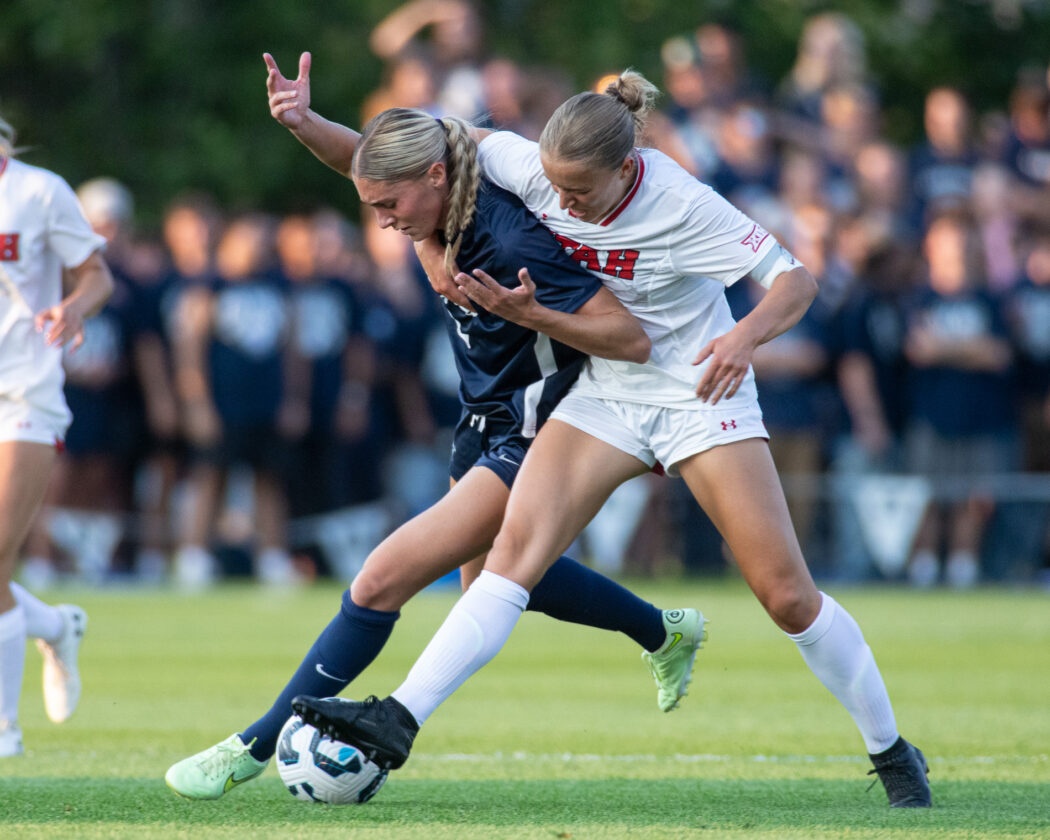 Utah's Ava Hetzel, 15, and USU's Kate Christian, 9, look to the referee after both falling to the ground in a challenge at Chuck & Gloria Bell Field on Aug 28.