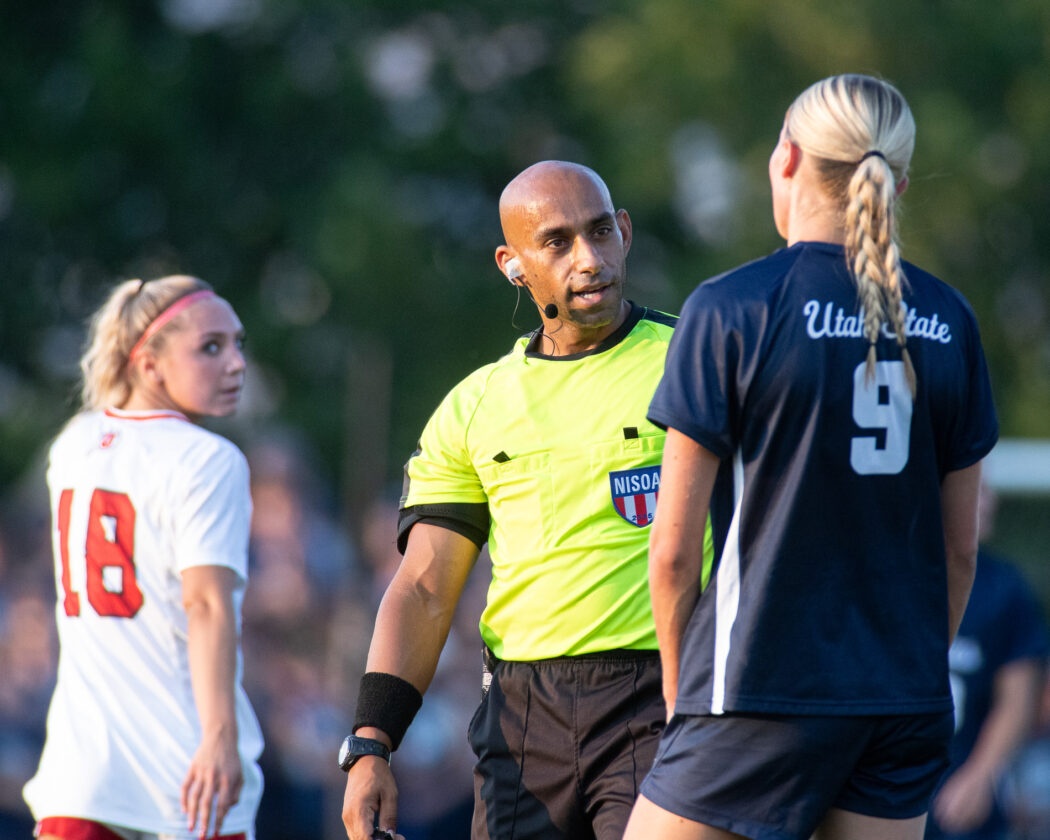 The center referee talks to Kate Christian, 9, after a short altercation with a Utah player at Chuck & Gloria Bell Field on Aug 28.