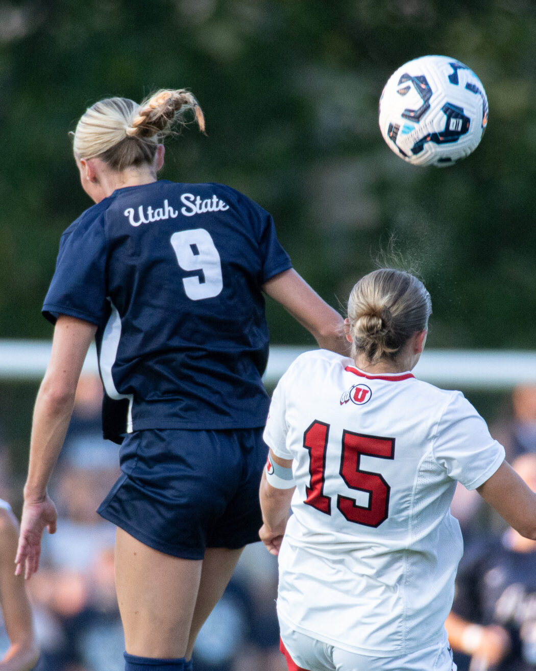 USU's Kate Christian, 9, and Utah's Ava Hetzel, 15, both leap into the air to get the ball at Chuck & Gloria Bell Field on Aug 28.