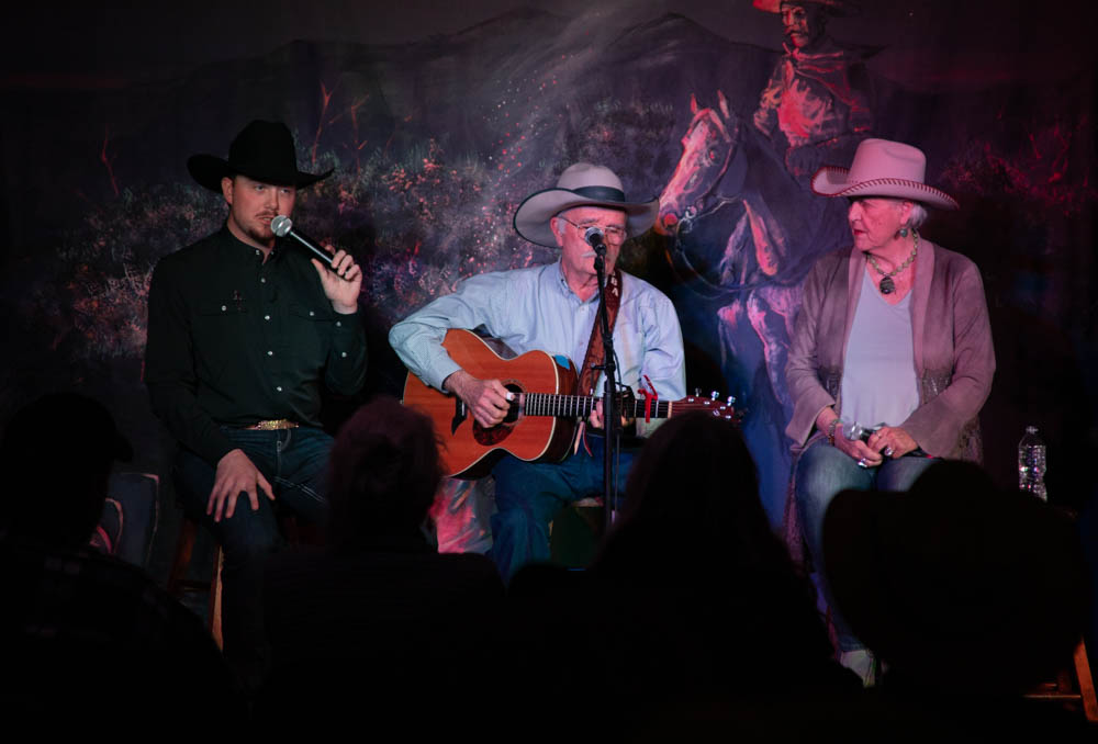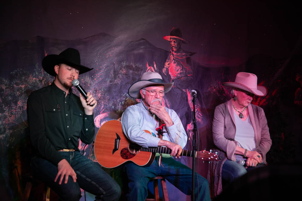 Dave Anderson (M) sings about the cowboy way of life, and his performance partners, Thatch Elmer (L) and Sam Deleeuw (R) who listen to him sing on March 5, 2025. (The Utah Statesman/Hazel Harris)