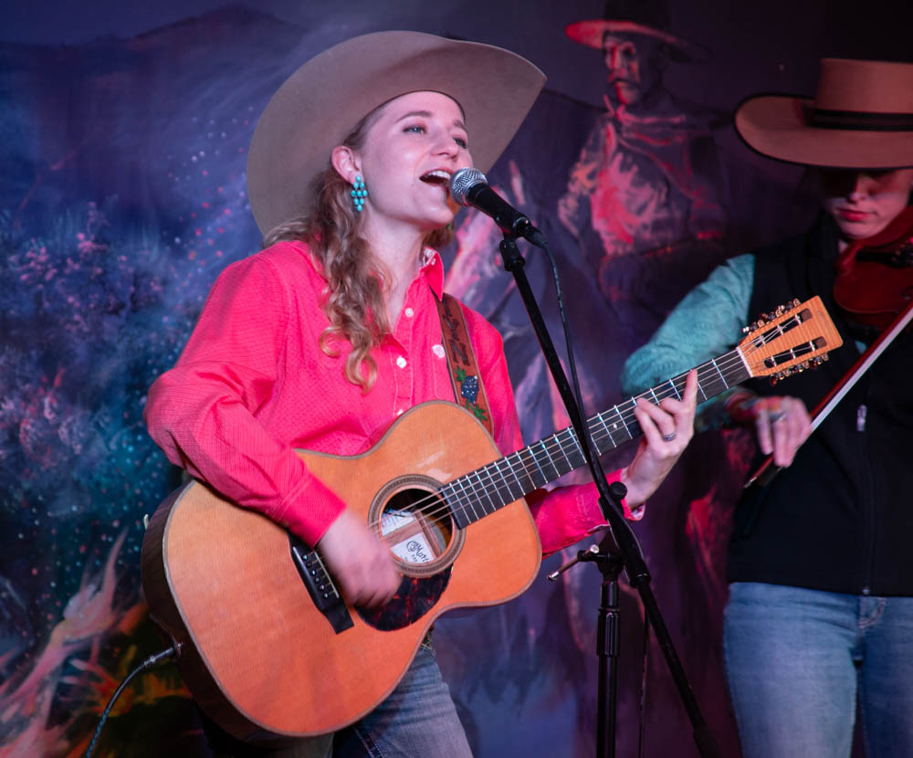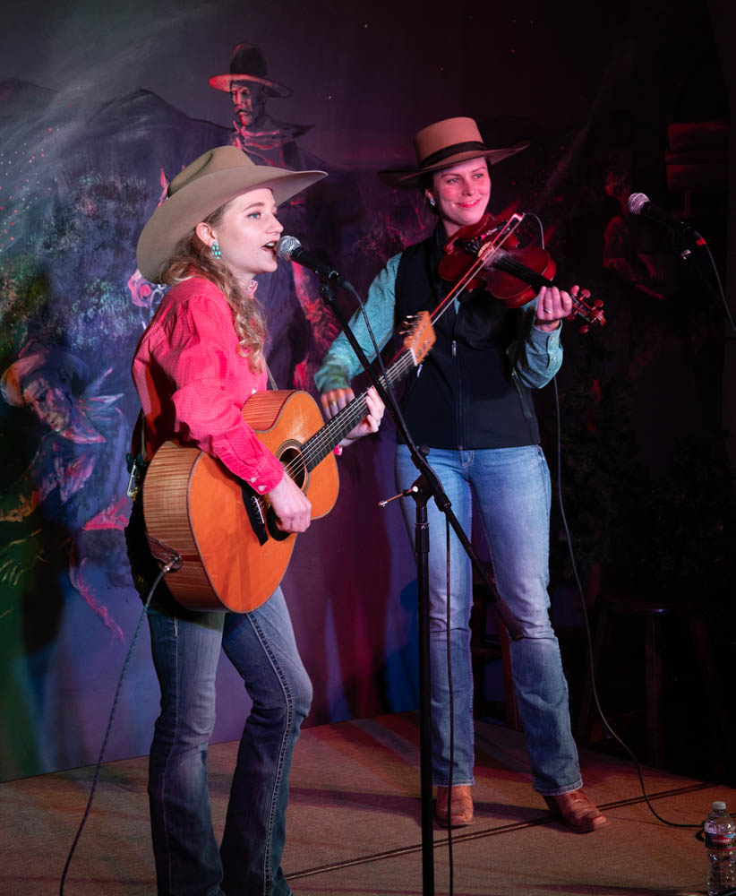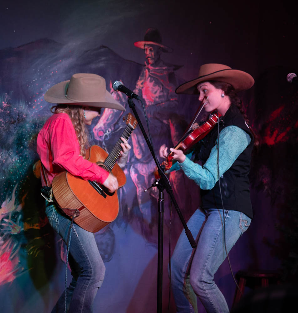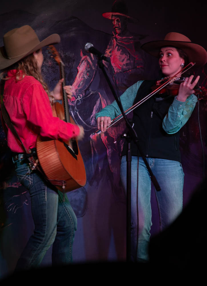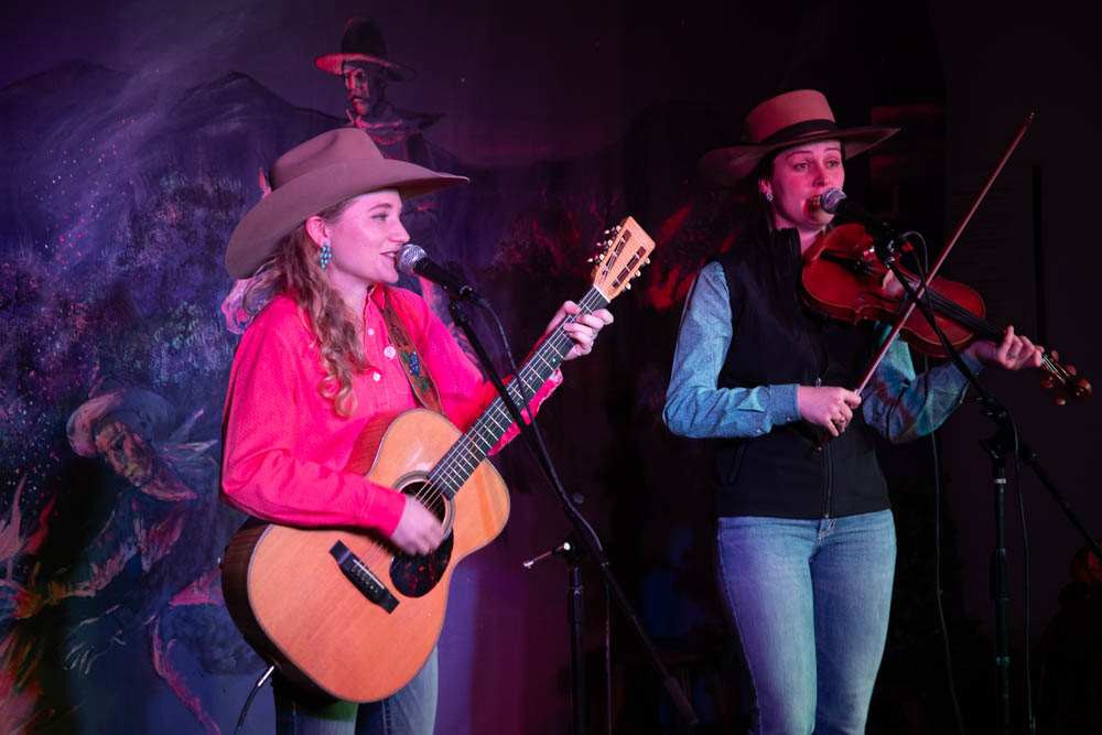 Kristyn Harris and Hailey Sandoz perform an quick and upbeat cowboy tune at the Cache Valley Cowboy Rendezvous on March 5, 2025. (The Utah Statesman/Hazel Harris)