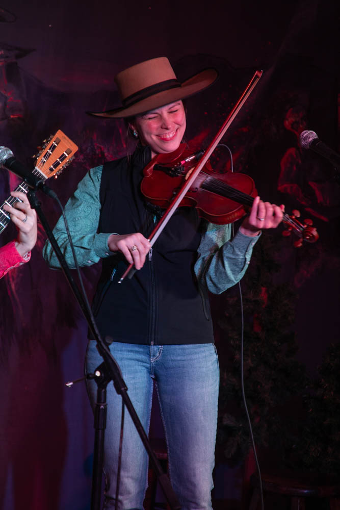 Hailey Sandoz grins while performing a quick and upbeat fiddle tune at the Cache Valley Cowboy Rendezvous on March 5, 2025. (The Utah Statesman/Hazel Harris)