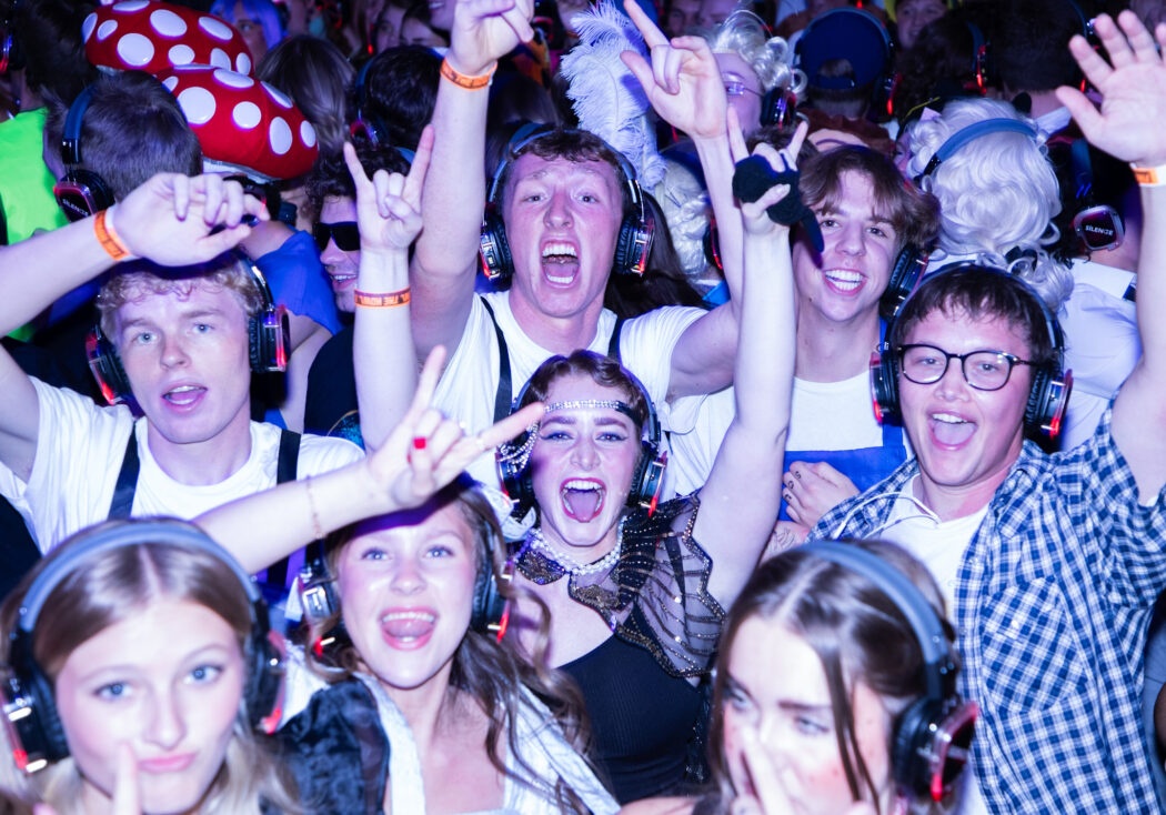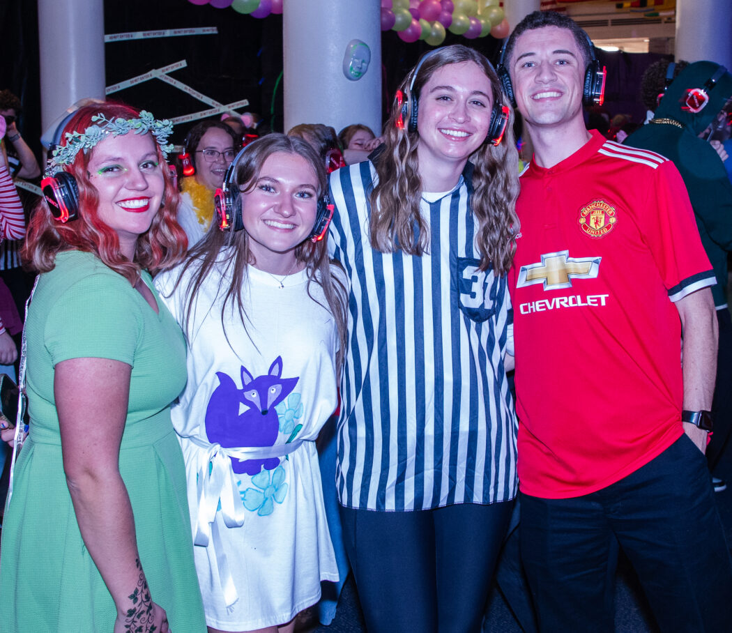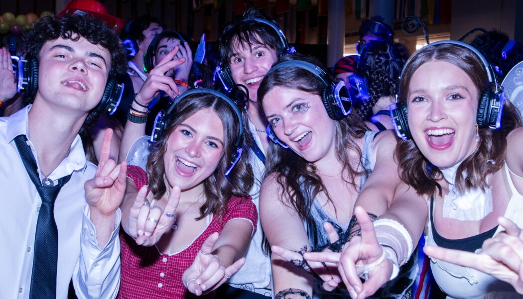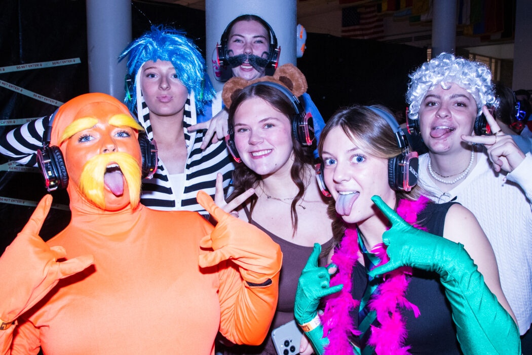 People pose for a photo as they dance in a silent disco at the Howl in the Taggart Student Center in Logan, Utah on Oct. 31. (Dane Johnson/The Utah Statesman)