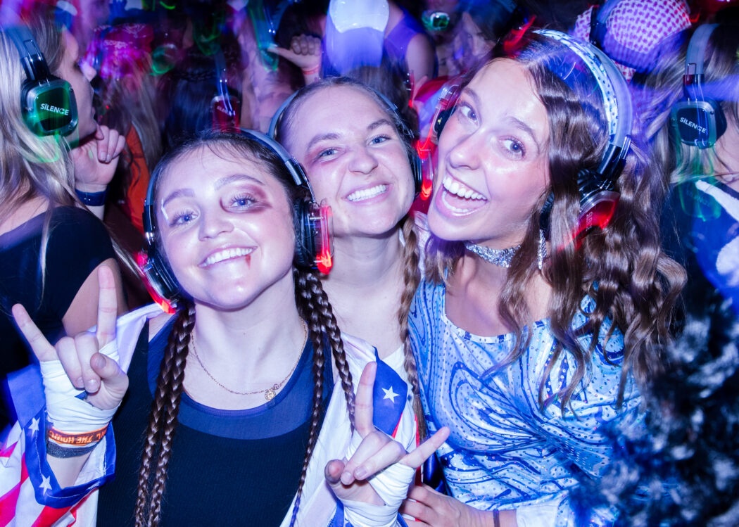 Three friends smile for a photo at the silent disco at the Howl in Logan, Utah on Oct. 31. (Dane Johnson/The Utah Statesman)