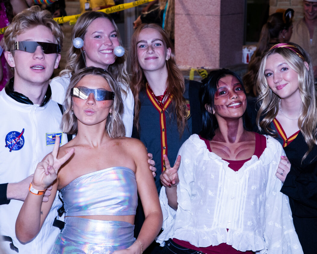 A group of friends pose for a photo in their Halloween costumes as they wait in line for an activity at the Howl in Logan, Utah on Oct. 31. (Dane Johnson/The Utah Statesman)