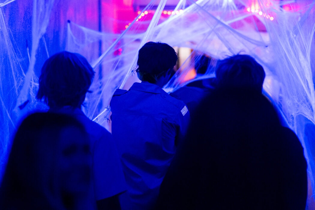 People walk through a hallway decorated for the Howl with artificial cobwebs in the Taggart Student Center on Oct. 31 in Logan, Utah. (Dane Johnson/The Utah Statesman)