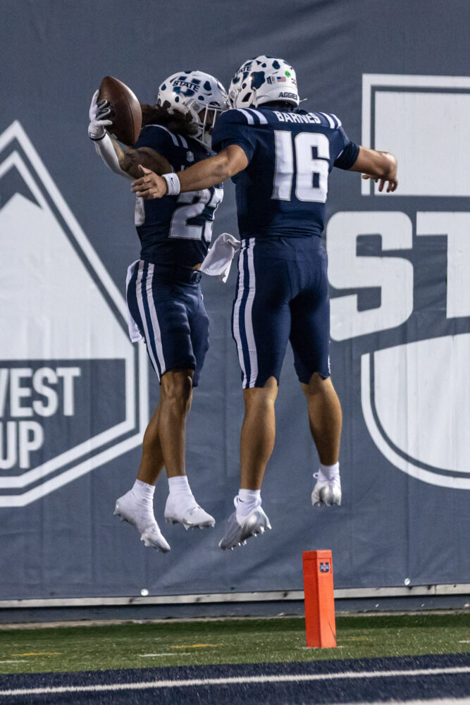 JACK LEWIS BURTON Kyrese White, 23, and Bryson Barnes, 16, celebrate a touchdown at Maverik Stadium on Aug 31, 2024.