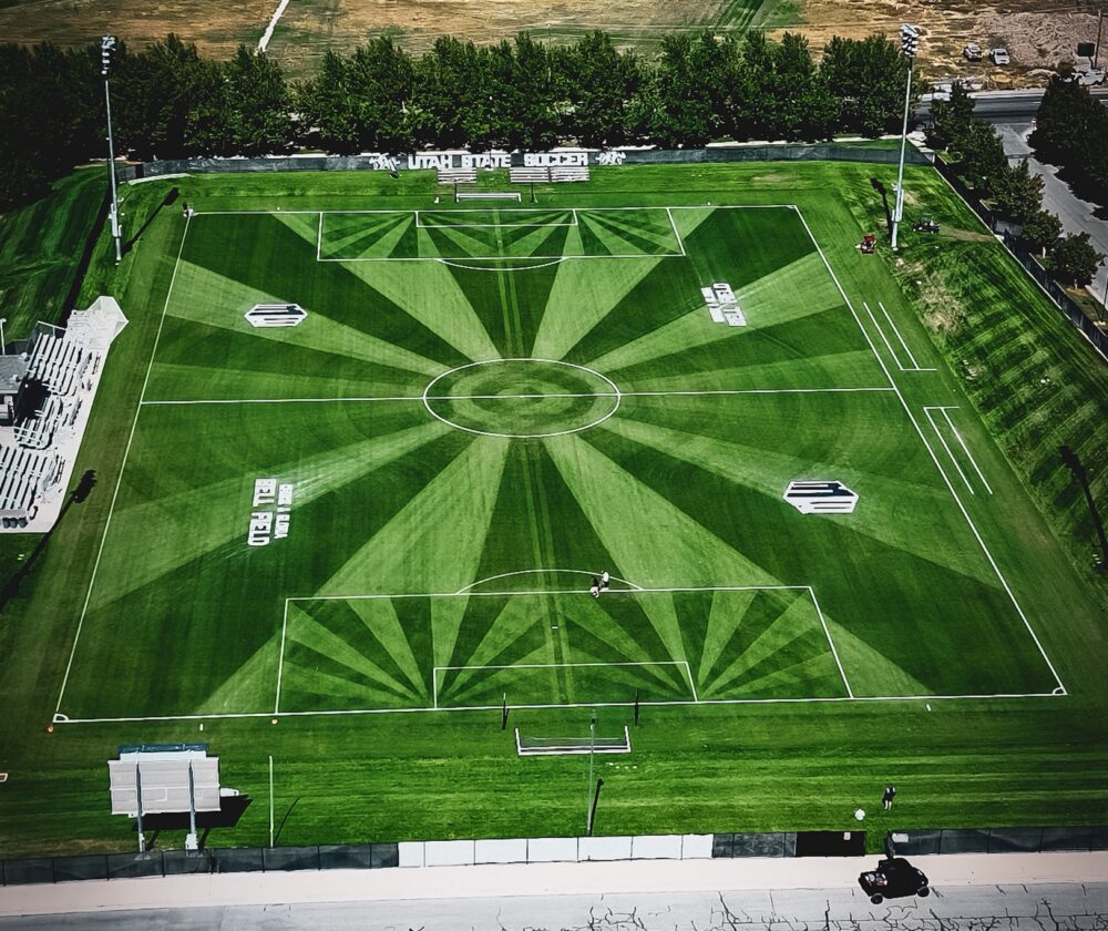 When fans walk into the Utah State University Chuck & Gloria Bell Soccer Field, their eyes don’t just land on the USU Soccer team — they’re drawn to the field itself. According to the students behind the field, it has become a showstopper, covered in intricate designs that have taken social media by storm. The field has become an unexpected show of Aggie pride, and the students behind it say it’s all fueled by love for both the craft and the campus.