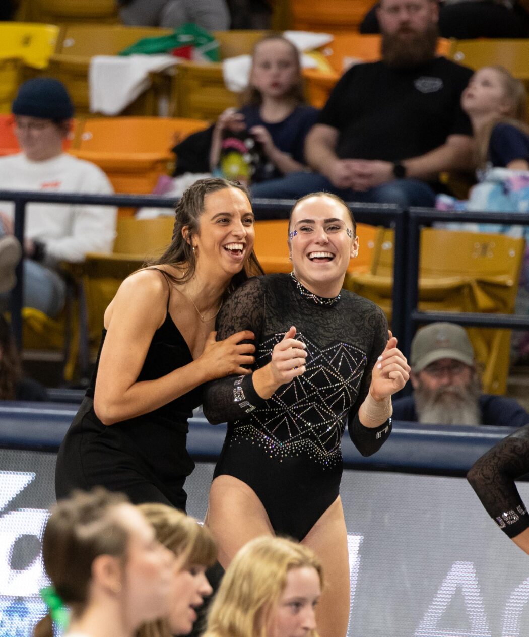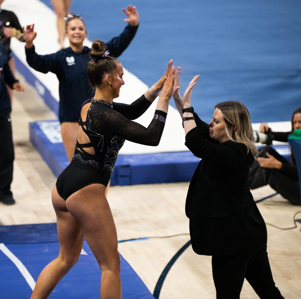 Lundy VanderToolen high fived head coach Kristin White after her vault on Feb. 21.