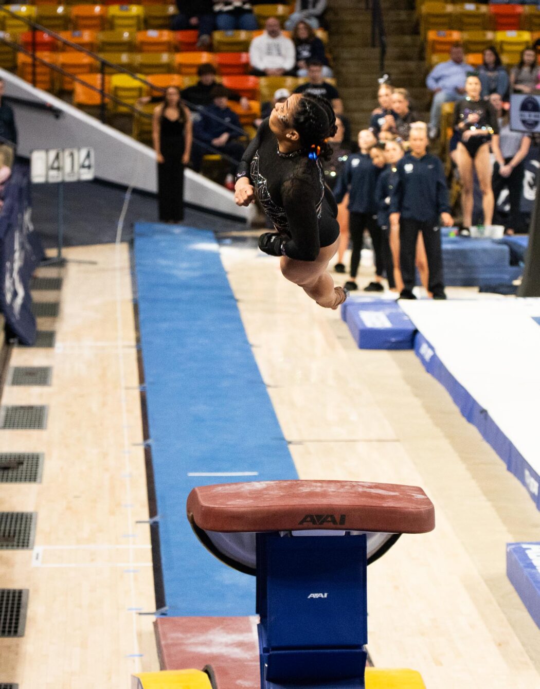 Brianna Brook's teammates cheer her on during her bars routine.