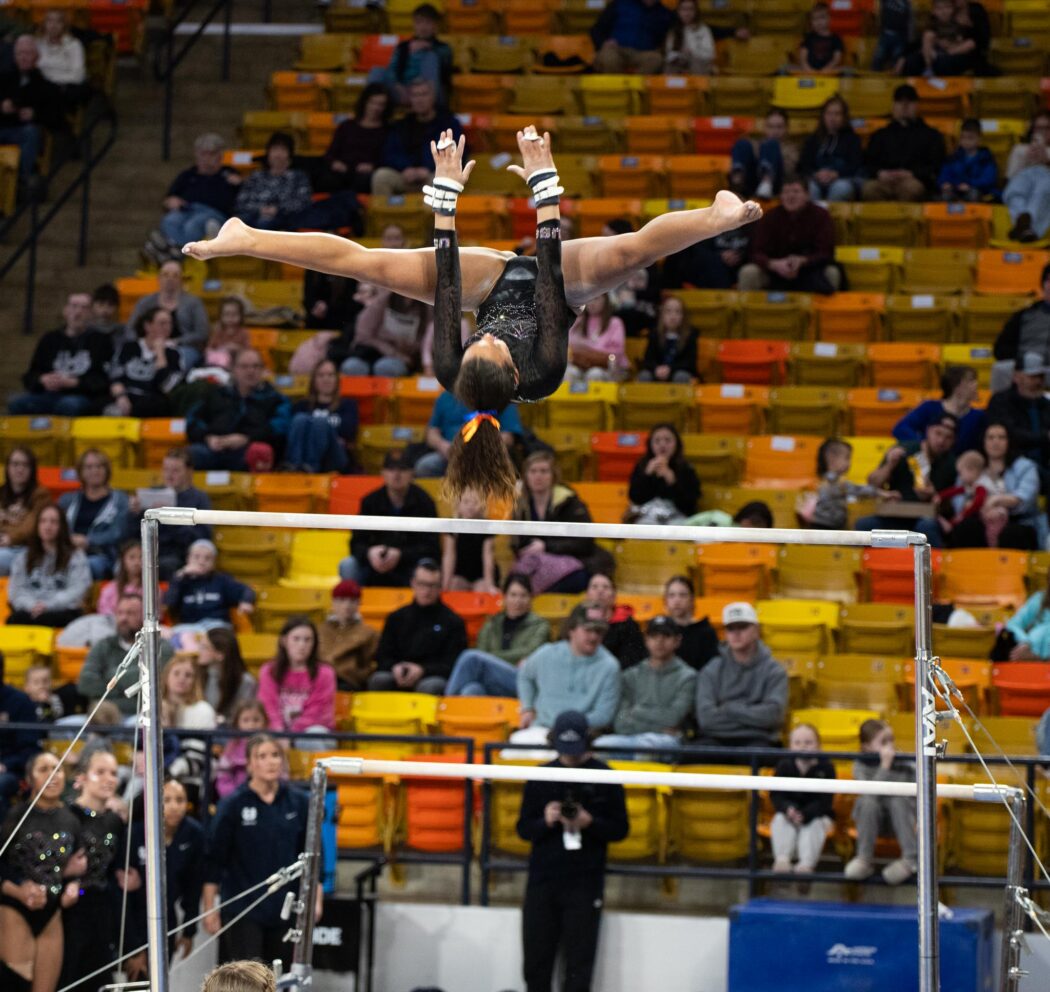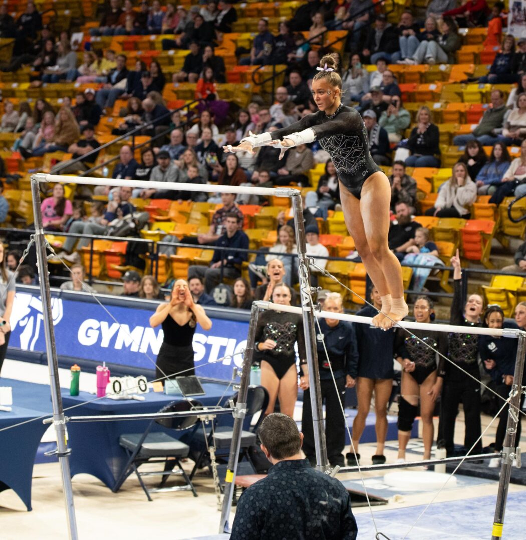 Freshman Olivia Orengo on the uneven bars on Feb. 21 at the Spectrum.