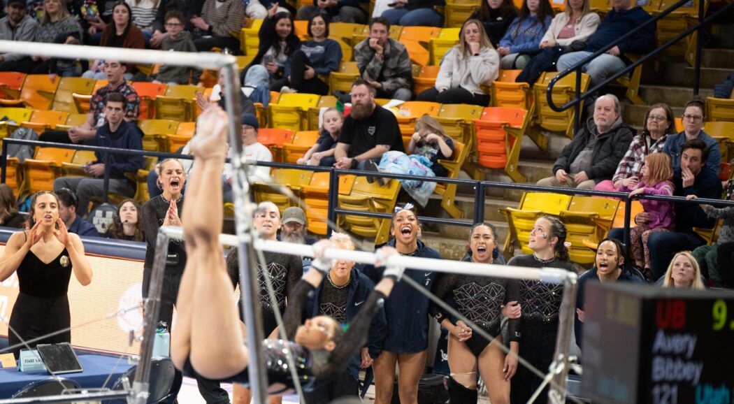 The team cheers on Marley Peterson during her floor routine on Feb. 22 at the Spectrum.