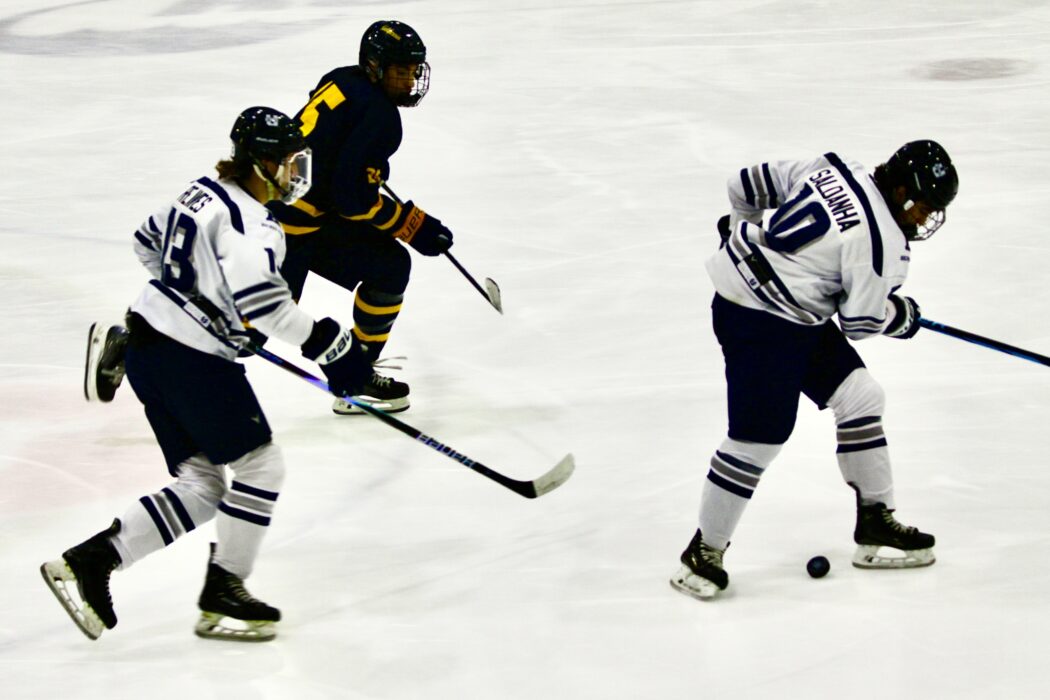 Ethan Saldanha passes the puck to Eli Reaves during a hockey game against Cal Berkeley on Nov. 20th, 2025. Photo by Hadley Sintay.