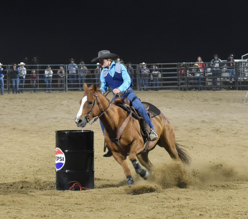 Made with Google AI Brooke Morris competes in barrel racing Sept. 16 at the Fall Stampede (photo by: Alyssa Cook)