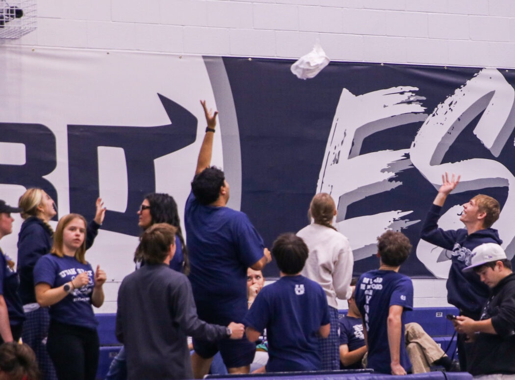 Members of The Hurd toss a T-shirt back and forth during the game against Boise State University in the Wayne Estes Center on Oct. 4. -Photo By Claire Ott