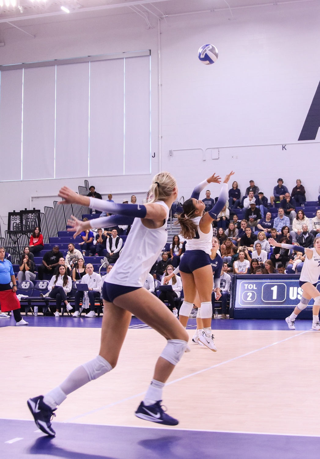 Kaylie Kofe, USU setter, sets the ball to Loryn Helgesen, USU opposite side hitter, during the game against Boise State University in the Wayne Estes Center on Oct. 4. -Photo By Claire Ott