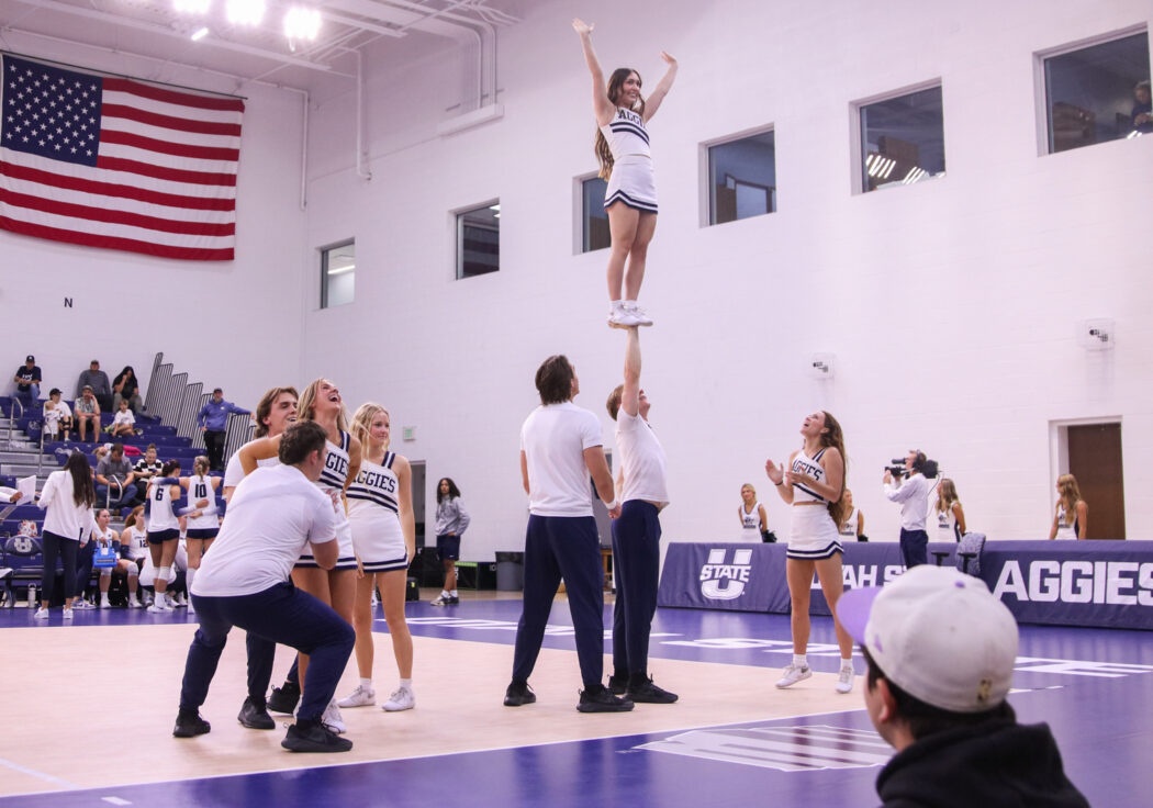 USU Spirit Squad compete to see who can do a one arm hold the longest during a break in the volleyball game against Boise State University in the Wayne Estes Center on Oct. 4. -Photo By Claire Ott