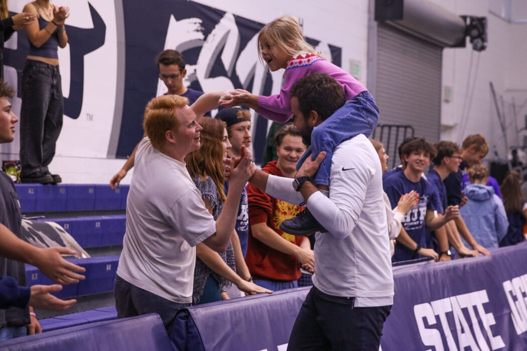 Rob Nielson, USU head volleyball coach, high fives members of The Hurd following the game against Boise State University in the Wayne Estes Center on Oct. 4. -Photo By Claire Ott
