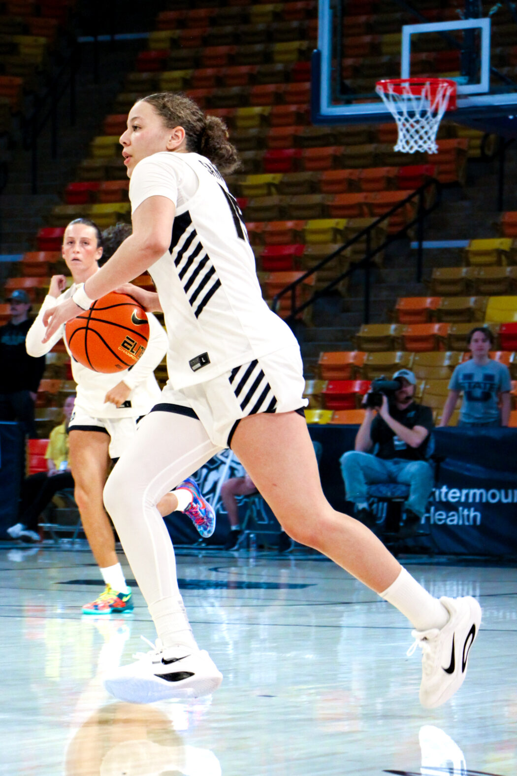 Aaliyah Gayles, 3, dribbles the ball down the court during a game vs Nevada on March 3rd. Photo by Hadley Sintay.