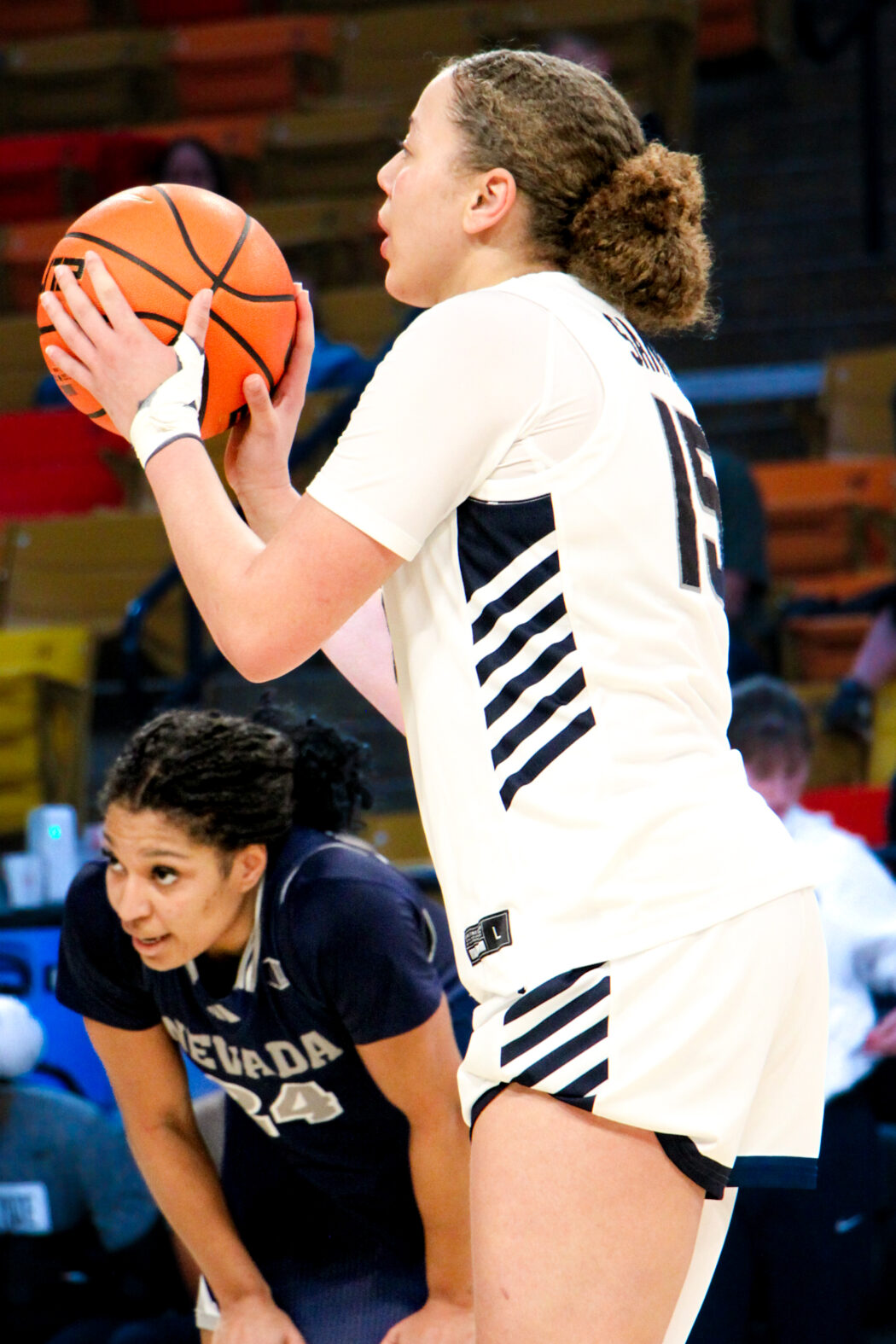 Jamisyn Heaton, 32, attempts to shoot a basket during a game vs Nevada on March 3rd. Photo by Hadley Sintay.