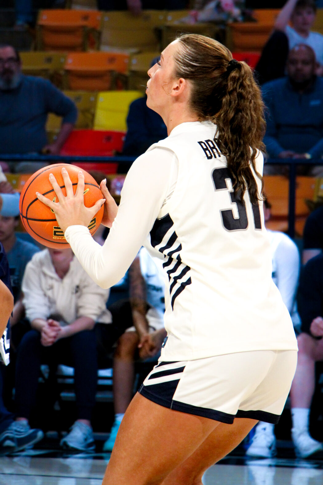 Macie Brown, 31, shoots a free throw in a game vs Nevada on March 3rd. Photo by Hadley Sintay.