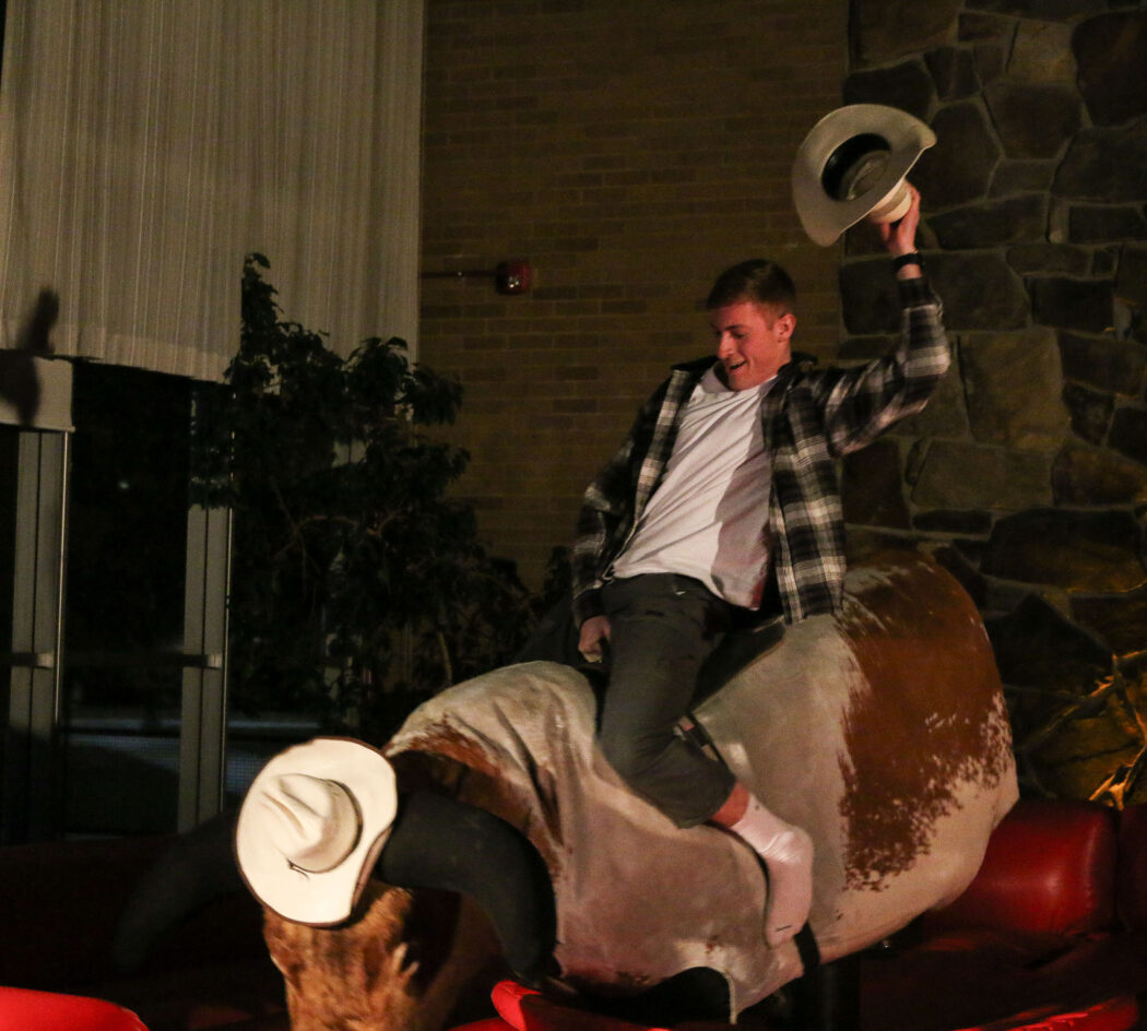 Cody Roberts rides the mechanical bull during Casino Night in the TSC on Feb. 7th.