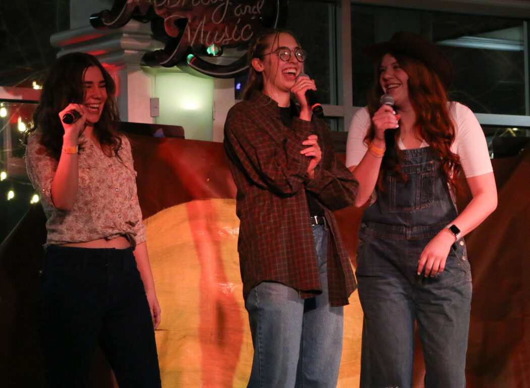 Raegan Rogers, Brita Renstrom, and Bella Wilson sing Fishin' in the Dark at karaoke during Casino Night on Feb. 7th.